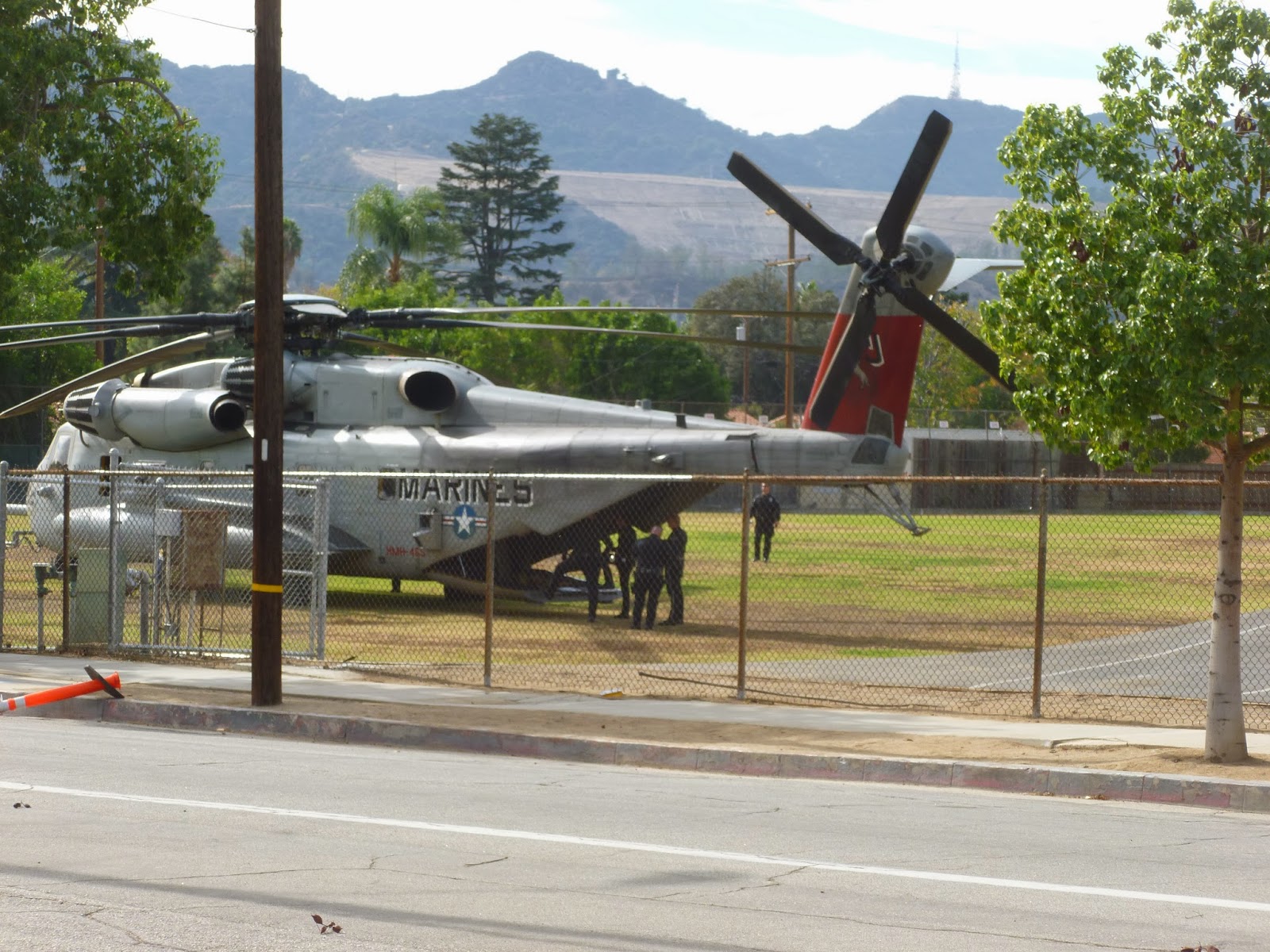 Over the weekend, we noticed the temporary “No Parking” signs on the streets. Our neighborhood knew something was about to happen. Not sure exactly what, but we learned quickly when four military helicopters landed on the field. This was the practice run. It was to deliver the President of the United States to Glendale for a tour of DreamWorks studio, just up the street from us.