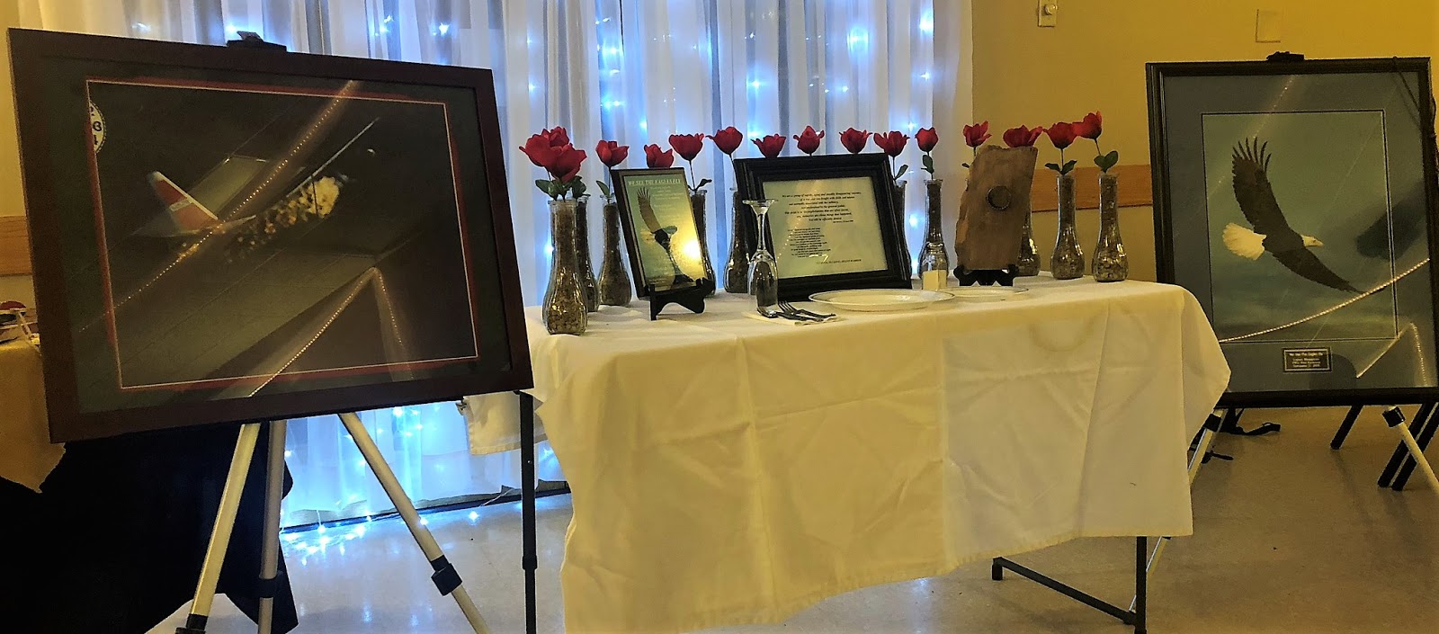 The acting President of the Prop Wash Gang, Chief Lonnie Henderson, emceed the program. He had set up a “Missing Man Table” at the center of the banquet hall. The table was set on a white tablecloth, containing 17 red roses in vases and a place setting for one – one representing them all. A shaker of salt next to the setting was a bitter reminder of what had transpired. There, the names of the 17 men were written along with the poem “We See the Eagles Fly.”