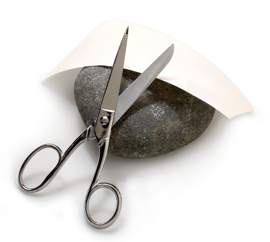 One of the early games we learn as children is the game of Rock, Paper, Scissors. Standing across from our opponent we produce one of these symbols as a hand gesture. A flattened hand is the symbol of paper, a clenched fist is a rock, and two fingers extending forward are scissors. Each item in this trinity has its own strength as well as its own weakness. Each has power over another and is overcome by another. Scissor cuts paper but is crushed by the rock. Paper covers the rock but is shredded by the scissor. Rock breaks the scissor but is made invisible by the paper.